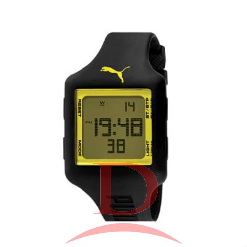 This casual style Puma watch has a flexible black polyurethane strap, black case, and a yellow transparent lens. The watch has a chronograph, a count-down time, 12/24 hour format, and a lap counter. I Continue reading →